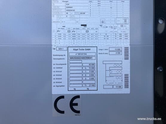 | Lisamärkused | PVC tööriistakast 923x422x460 mm, 2xLED lisa tagurdustuld, SAF ketas 430mm, esimene sild tõstetav, kaks varurattakandurit , 24 paari 5t keti/koormarihma kinnitusi, esiseinal sees tugevdusplaat |
